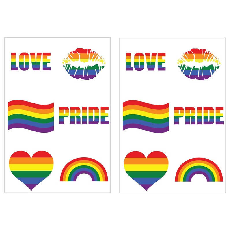 Regenboog pride kleuren plak tattoos 12 stuks. 2 blisterkaarten met 6 vrolijk gekleurde plak tatoages van ongeveer 5 x 5 cm per stuk. Gay pride/LHBT thema accessoires.