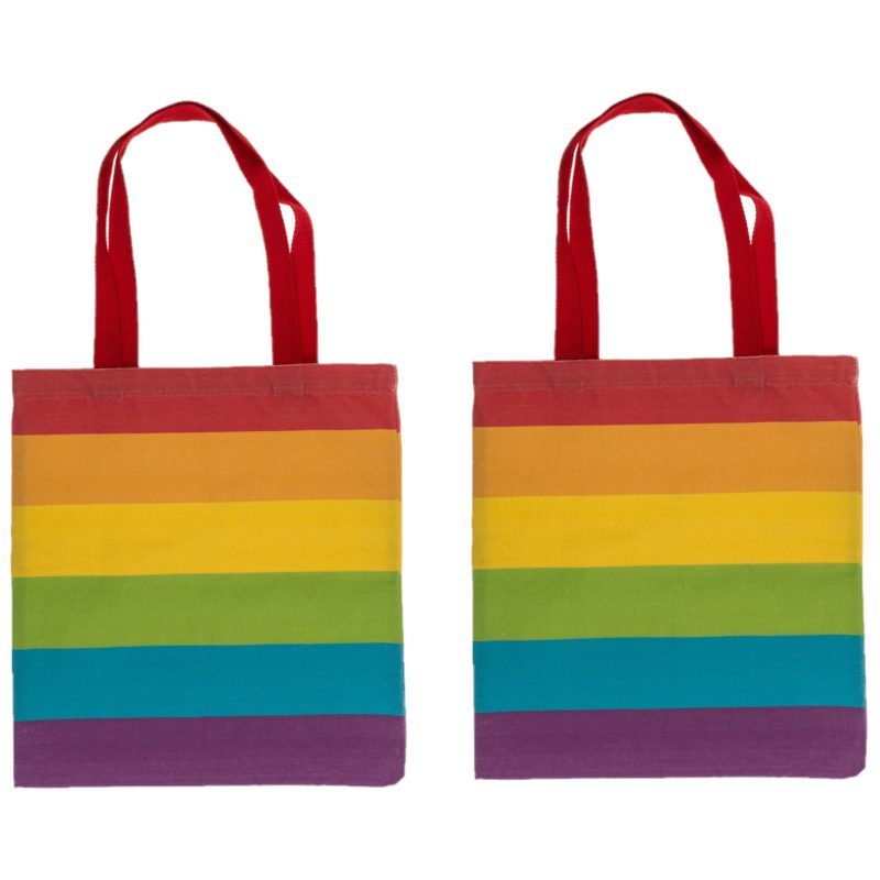 2x Draagtas in Pride/regenboog thema kleuren, gemaakt van katoen met formaat 35 x 40 cm. LHBTIQ+ en Gay Pride festival musthaves artikelen. Uitingen van verdraagzaamheid door regenboogvlag kleuren artikelen te gebruiken. Boodschappentas.