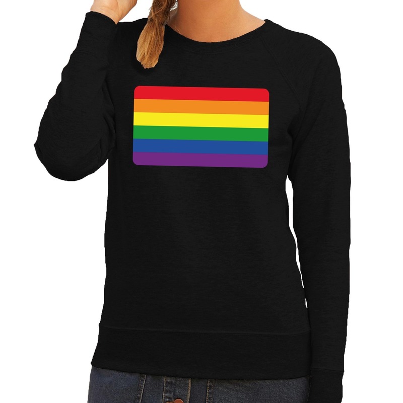 Gay pride regenboog vlag sweater zwart voor dames. Op deze zwarte lhbt sweater staat in regenboog kleuren de afbeelding van een vlag. Materiaal: 80% katoen/20% polyester, 240 grams kwaliteit. Gay pride kleding.