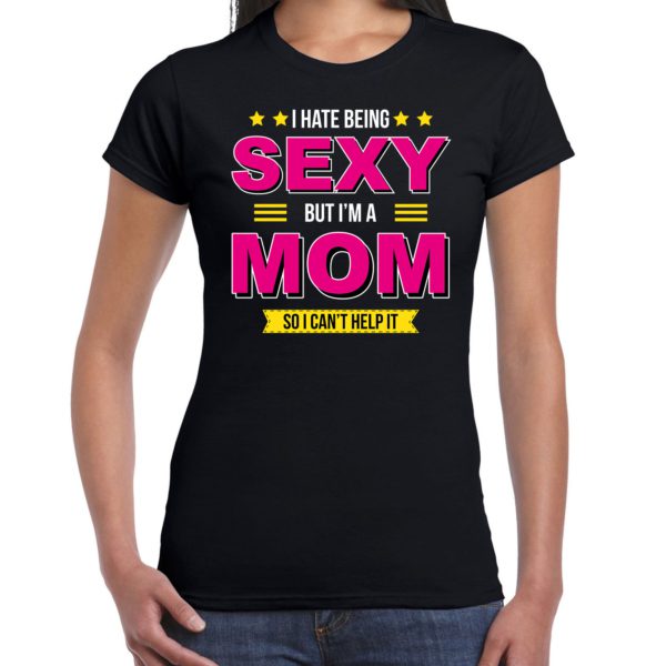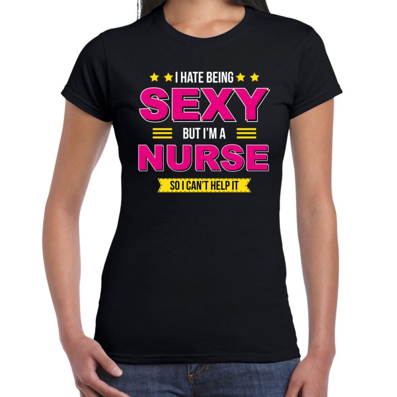 Hate being sexy but Im a nurse / Haat sexy zijn maar ben verpleegster cadeau t-shirt zwart voor dames. Op dit zwarte shirt staat in roze / witte letters de tekst: I hate being sexy but Im a nurse so I cant help it.