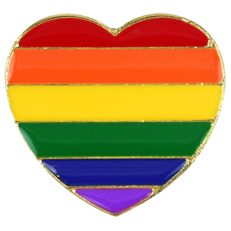 Regenboog pride hartje pin/broche van 3 cm. Goudkleurige, metalen broche/pin met regenboog print voor bijvoorbeeld op je tas of revers van je jas, maar ook als give-away! Materiaal: metaal. Gay pride/LHBT thema accessoires. Let op: dit is een verkleedaccessoire voor volwassenen, geen speelgoed.