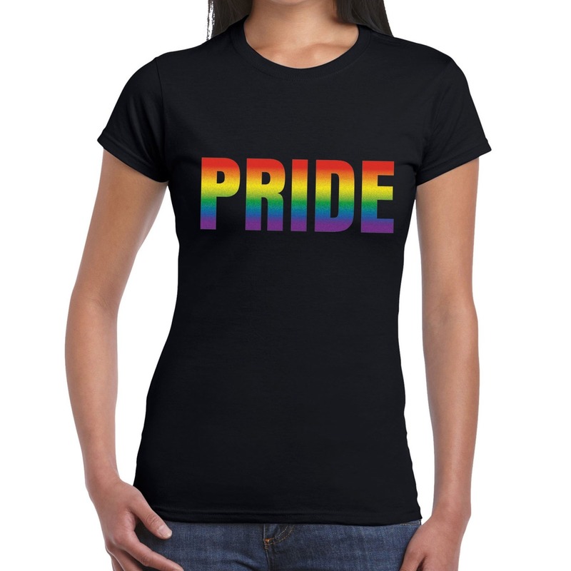 Regenboog vlag Pride shirt roze heren. Op dit LGBT shirt staat groot de Regenboog vlag met de tekst Pride. Leuk t-shirt voor de Gay Pride of ander evenement. Materiaal: 150 grams, 100% katoen.
