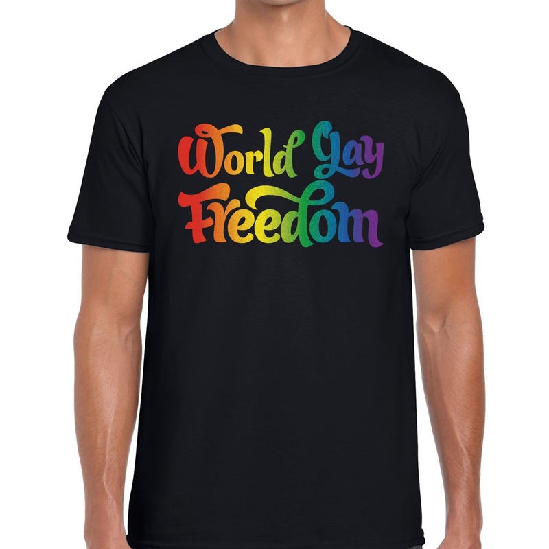 World gay freedom t-shirt zwart voor heren. Op dit zwarte LGBT shirt staat de tekst World gay freedom in regenboog kleuren met water effect. Materiaal: 100% katoen 150 grams kwaliteit. Gay pride kleding.